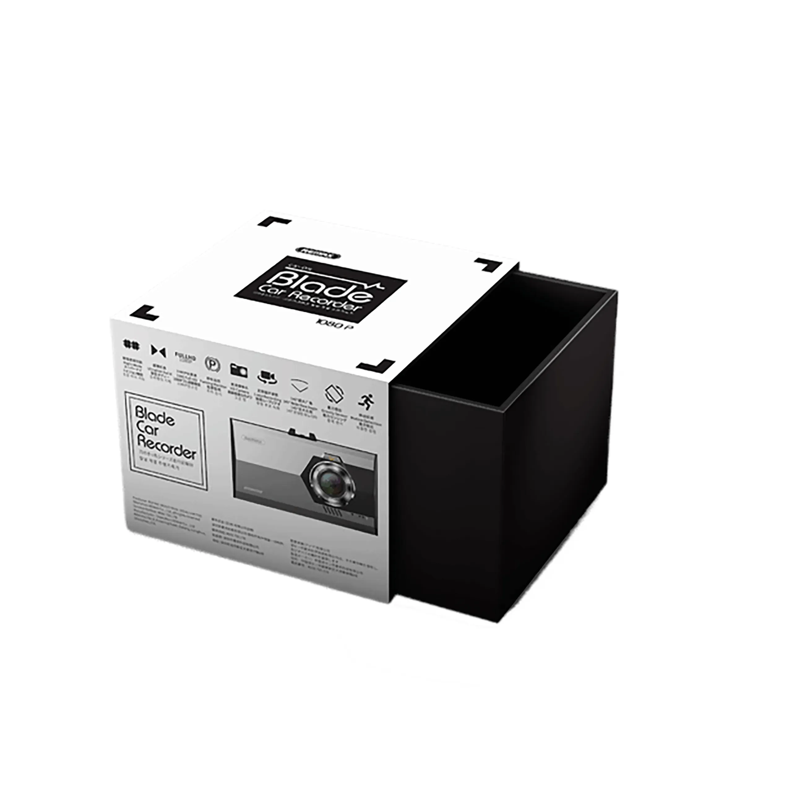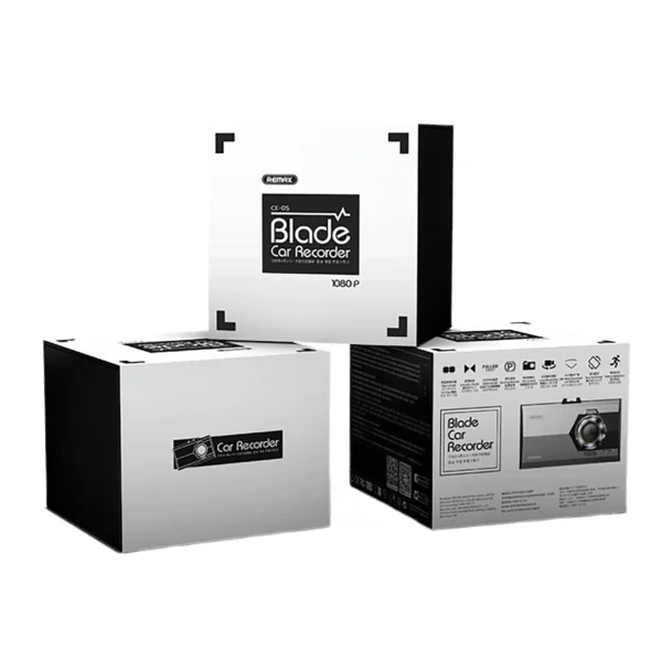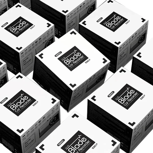 The Blade Car Recorder packaging box sports a classic black-and-white design, both chic and straightforward. The upper part boasts a crisp white backdrop adorned with striking black graphics and text, generating a bold visual appeal. The lower half, cloaked in black, displays white, easy-to-read text, emphasizing crucial details like product name, model, and purpose. This packaging mirrors the recorder’s professionalism, emphasizing its practicality, and ensures a smooth, secure recording journey for drivers.
