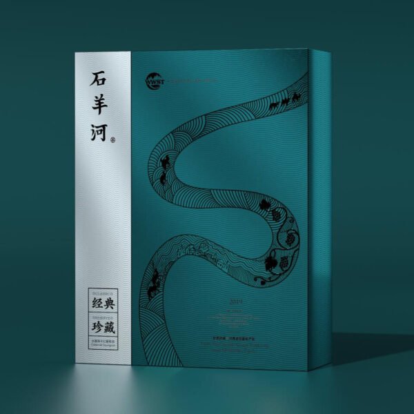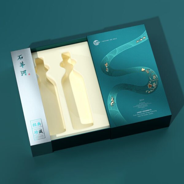 Crafted in dark green and silver, this white liquor packaging box exudes nobility and elegance. Its facade boasts exquisite gold accents, mirroring the brand’s prestige and mystique. Within, three sleek white items, meticulously wrapped, hint at the wine’s purity and finesse. A dark blue backdrop heightens its unique charm, contrasting beautifully with the box’s hues. Lit gracefully, details reveal master craftsmanship, igniting anticipation for the exquisite white wine within.