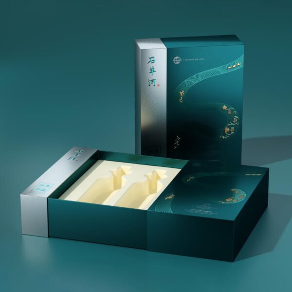 This white liquor packaging box with dark green and silver as the main color, showing the noble and elegant temperament. The face of the box is exquisitely designed, with gold-colored text and patterns that reflect the brand’s prestigious status and add a touch of mystery. Inside the box, there are three long white objects neatly arranged, which are carefully wrapped, signaling the purity and elegance of the white wine inside. The background is a uniform dark blue, which contrasts sharply with the color of the liquor packaging box, accentuating its exquisiteness and uniqueness. The whole scene is illuminated by light, making it appear more layered, and the details show the craftsmanship, which makes people full of expectations for the white wine inside the box.