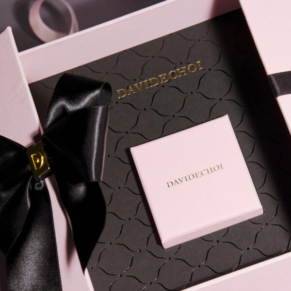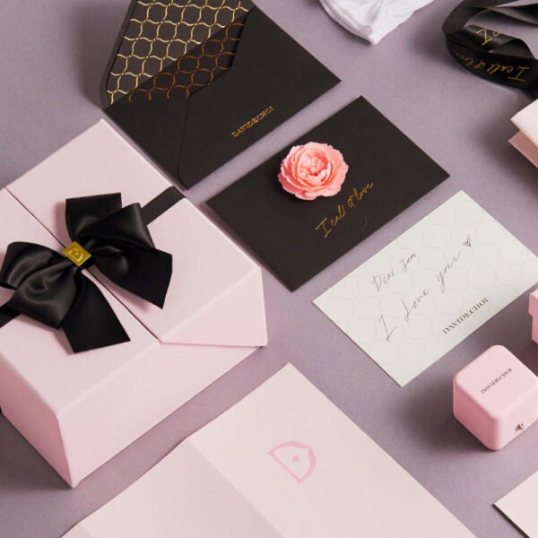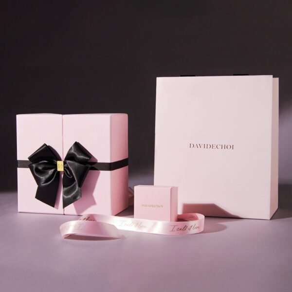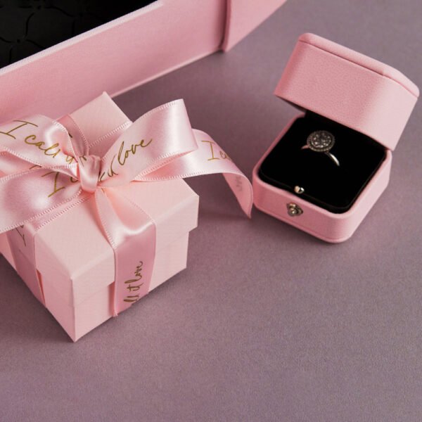 This charming pink jewelry packaging box reveals a silver ring resting on a sleek black lining. Adorned with golden inscriptions “LOVE” and “LUXURY,” it also sports intricate decorative patterns. Tied with a soft pink ribbon embossed with “LOVE.” It stands out against a gray backdrop, exuding elegance and a touch of romance.